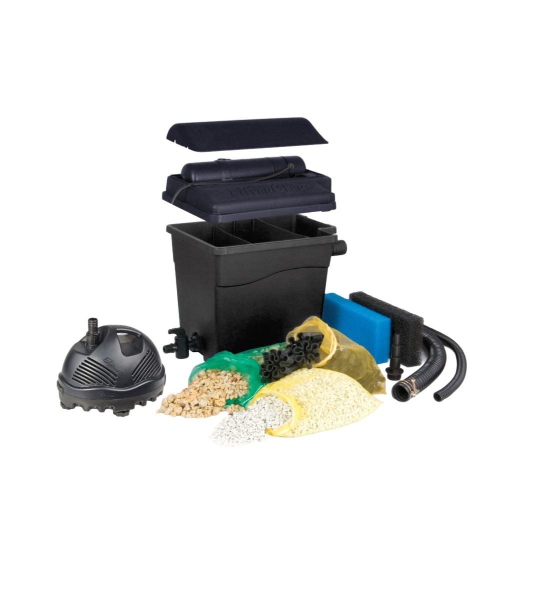 De Ubbink FiltraClear 6000 wordt geleverd als complete set, inclusief een bijpassende Ubbink Elimax 1500 pomp, een UVC apparaat van 9 Watt, een afvoerslang, een verbindingsslang van pomp naar filter en een aansluitset. Hierdoor hoef je geen extra accessoires aan te schaffen en kun je direct aan de slag met het installeren van dit hoogwaardige filtersysteem.