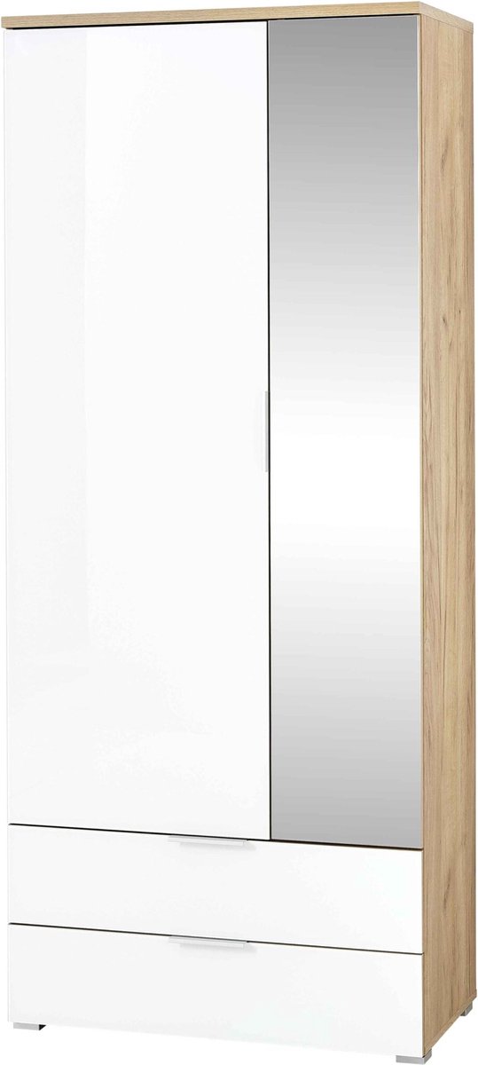 Garderobekast Tille met 2 deuren & 2 lades in eikdecor met witte glazen fronten. Meubel gemaakt uit spaanplaat, voorzien van een spiegeldeur en afgewerkt met een laagje melamine. Specificaties • Kleur: Wit • Lengte: 84 cm • Hoogte: 196 cm • Diepte: 40 cm • Materiaal :SPAANPLAAT Uit voorraad leverbaar, dus supersnel in huis! Tevens ontvang je 2 jaar garantie en mag je binnen 30 dagen retourneren. Deze Tille-collectie heeft... lees meer over dit product