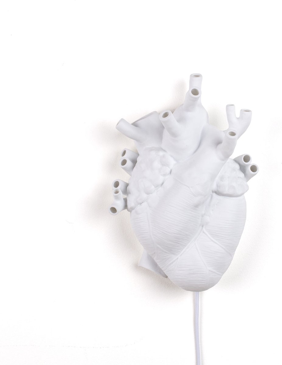 Heart lamp van Seletti. Lamp in de vorm van een anatomisch hart. De hart lamp is gemaakt van porselein en heeft een witte kleur. Deze lamp is een echte eye-catcher in je interieur. Hij wordt aan de muur bevestigd en werkt op netstroom. Wordt geleverd inclusief ledlamp (E14, 4W) en geeft warmwit licht (2700 Kelvin). De lamp in de vorm van een anatomisch hart heeft een afmeting van 32 x 22 x 11 centimeter. lees meer over dit product