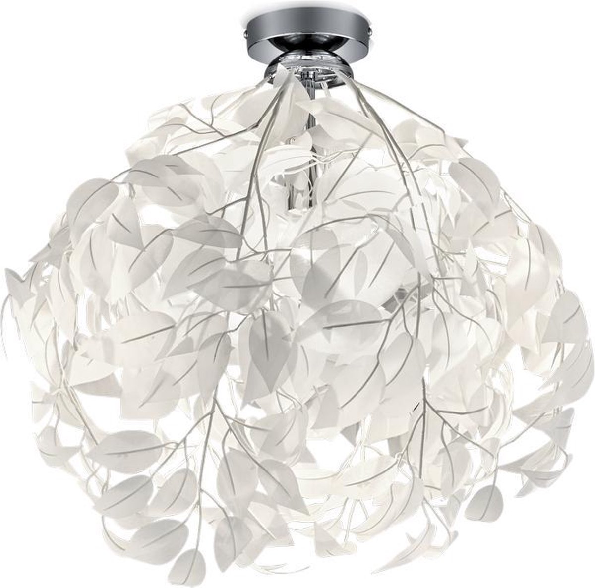 Deze weelderige trendy plafonniere uit de Leavy familie is gemaakt van hoogwaardig metaal in chroom kleur met draadstalen takken voorzien van witte stoffen blaadjes. De takken met blaadjes zijn eenvoudig te monteren en naar wens de modelleren. Het armatuur is geschikt voor drie lichtbronnen met een E27 fitting, heeft een hoogte van max 73cm en de diameter bedraagt 70cm.