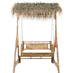 De schommelbank wordt geleverd met een overkapping bedekt met exotische palmbladeren, waardoor je buitenruimte een vleugje tropische charme krijgt. Of je nu wilt relaxen in de schaduw of genieten van de zomerzon, deze overkapping biedt de perfecte bescherming en sfeer.