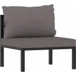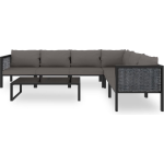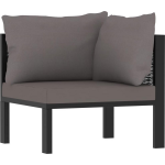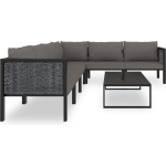 De loungeset is uitgevoerd in een stijlvolle antraciet en zwarte kleur, waardoor hij in elke tuin of op elk terras past. De kussens hebben een donkergrijze kleur, wat mooi contrasteert met het geheel. De totale afmetingen van de set zijn 264 x 200 x 64 cm (B x D x H) en de zithoogte is 32 cm.