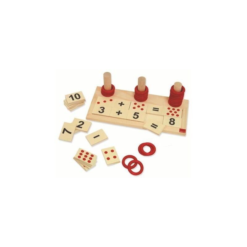 Houten spel om spelenderwijs te leren optellen en aftrekken. Met cijfers, afbeeldingen en hoeveelheden. lees meer over dit product