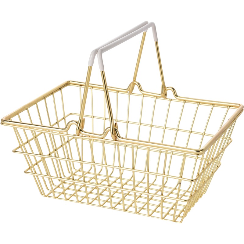 Goudkleurig Decoratie MandjeVoeg een vleugje elegantie toe aan uw interieur met dit prachtige goudkleurige (boodschappen) mandje. Met zijn witte handvaten is dit mandje niet alleen functioneel, maar ook een decoratief stuk dat perfect is voor het neerzetten van huiselijke spulletjes of opgerolde handdoeken. Het mandje heeft een afmeting van ca. 18 x 13 x 8 cm en is gemaakt van duurzaam metaal.Dit mandje is echt een blikvange... lees meer over dit product