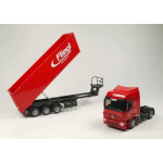 Ontdek de nieuwste Mercedes-Actros-bestuurderscabine met het spoilerpakket als 2-assige trekker, als basis voor de vrachtwagen met kiepwagen en kantelbak. De 3-assige oplegger van Fliegl is uitgerust met een stevig metalen chassis. De kantelbare bak en de trap met platform, gemonteerd op het chassis, zijn vervaardigd van duurzaam kunststof. Met de beweegbare steunpoten en de achterklep die open kan, brengt deze krachtige trekker met oplegger een indrukwekkend beeld naar bouwplaatsen en agrarisch transport. Laat je verbeelding de vrije loop en creëer je eigen spannende avonturen met deze realistische en veelzijdige vrachtwagen.