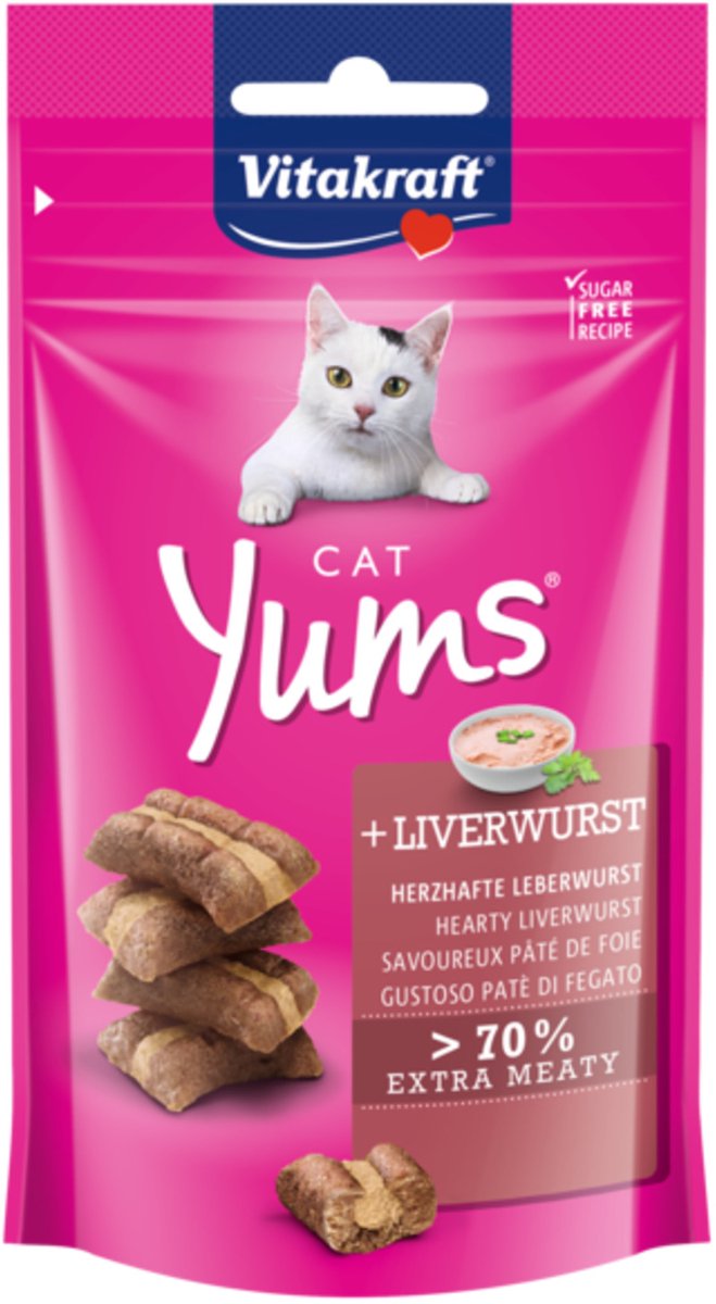 Sappige kattensnacks met leverworst. Cat Yums zijn met de beste ingrediënten en volgens suikervrije receptuur bereid. Elke snack is gevuld met een zachte, zichtbare vulling en extra vlees. De snacks zijn met zorg in de oven bereid. • met zichtbare vulling• extra vlezig (70%)• suikervrije receptuur• in hersluitbare verpakking lees meer over dit product