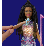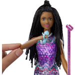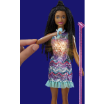 De Barbie-pop "Brooklyn" is gekleed in een prachtige jurk en draagt blauwe schoenen. Met accessoires zoals een gitaar, headset, microfoon en standaard kan ze het podium rocken en haar talent laten zien. Deze pop is het perfecte cadeau voor kinderen van drie tot zeven jaar die dol zijn op zingen en muziek.
