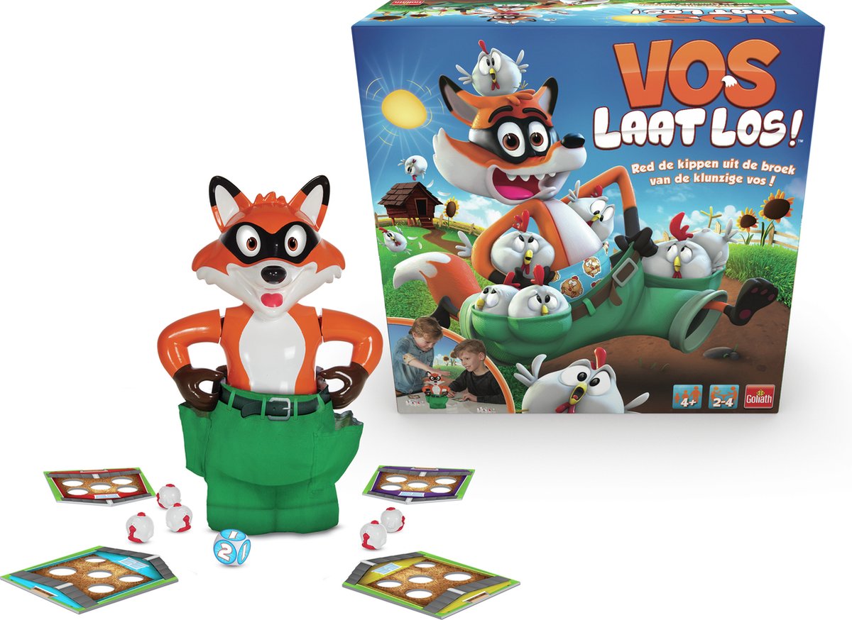 De gemene vos is net het kippenhok binnengedrongen! Gelukkig is hij zo onhandig dat hij over zijn eigen broek struikelt. Zo hebben de kippen nog de kans om ongedeerd te ontsnappen! Heb jij als eerste jouw kippenhok gevuld met kippen? Dan heb je gewonnen! Spelomschrijving Vos Laat Los Het doel van Vos Laat Los is om als eerste speler 5 kippen veilig naar je kippenhok brengt. De speler die begint rolt de dobbelsteen en stopt zov... lees meer over dit product