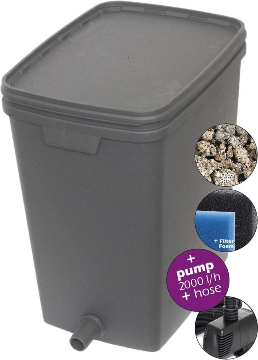 Het compacte vijverfilter is gemaakt van duurzaam kunststof en heeft een zwarte kleur, waardoor het mooi opgaat in de omgeving van je vijver. Met afmetingen van 39 x 29 x 44 cm (L x B x H) is het filter compact en neemt het weinig ruimte in beslag. Dankzij de meegeleverde pomp en afvoerslang is het filter eenvoudig aan te sluiten op je vijver. Daarnaast wordt ook alle benodigde filtermedia meegeleverd, zodat je direct aan de slag kunt.
