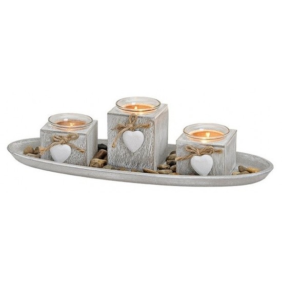 Houten Schaal Met 3 Waxinelicht/theelicht Houders Met Hartjes - Kaarsenplateaus - Grijs