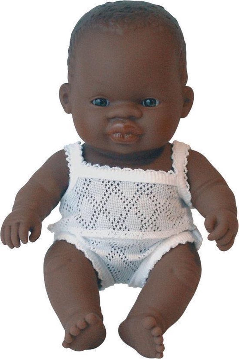 Prachtig baby popje van het Spaanse merk Miniland. Dit mooie Afrikaanse baby jongetje ruikt heerlijk naar vanille en de pop is volledig waterdicht. Hierdoor kan de pop ook gezellig mee in bad, naar het zwembad of naar het strand. De pop wordt geleverd met wit ondergoed aan, een hemd en een onderbroek.