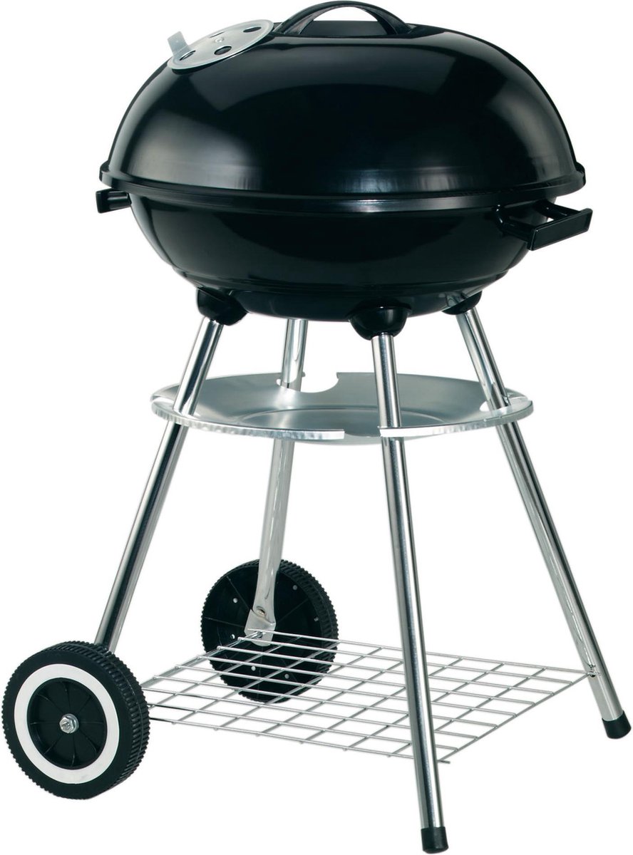 De kogelbarbecue is wellicht de meest functionele en iconische barbecue die werkt op houtskool of briketten. Dit verrijdbare model heeft een grilloppervlak van ca. 44 cm. en een werkhoogte van 58 cm, Door gebruik te maken van het deksel kunt u naast direct barbecueen tevens indirect barbecueen.Dankzij de vier poten, waarvan twee v.z.v. wielen, staat deze barbecue stabiel en is deze goed te verplaatsen. Bovendien beschikt deze barbecue over een as-vanger en kunt u deze eenvoudig schoonmaken. Kleur: zwart geemailleerd.