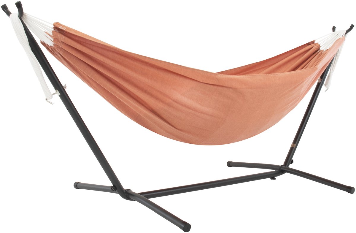 De dubbele hangmat is gemaakt met Sunbrella-stof om elk seizoen, jaar na jaar, mee te gaan. Het is net zo comfortabel als katoen en vormt het perfecte toevluchtsoord voor een middagje lekker liggen. De standaard is gemaakt van robuust staal en kan in enkele minuten zonder gereedschap worden gemonteerd. De verzinkte poten voorkomen roest en plastic doppen aan de uiteinden van de stalen buizen zorgen voor een zachte afwerking. De standaard biedt u de vrijheid om uw hangmat op de meest geschikte locatie op te stellen en de meegeleverde premium draagtas maakt het gemakkelijker dan ooit om met uw nieuwe hangmat en standaard te reizen.
