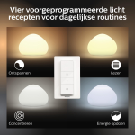 Met de Philips Hue Wellner tafellamp kun je de perfecte lichtrecepten creëren voor al je dagelijkse activiteiten. Ervaar het gemak en de aangename sfeer van vier standaardlichtrecepten die speciaal zijn ontworpen voor verschillende momenten van de dag. De Energie en Concentratie scènes helpen je 's ochtends op gang te komen en je scherp te houden, terwijl de Lezen en Ontspannen scènes perfect zijn voor het lezen van een boek of om volledig te ontspannen na een drukke dag. Met de Philips Hue Wellner tafellamp creëer je moeiteloos de juiste ambiance voor elk moment.