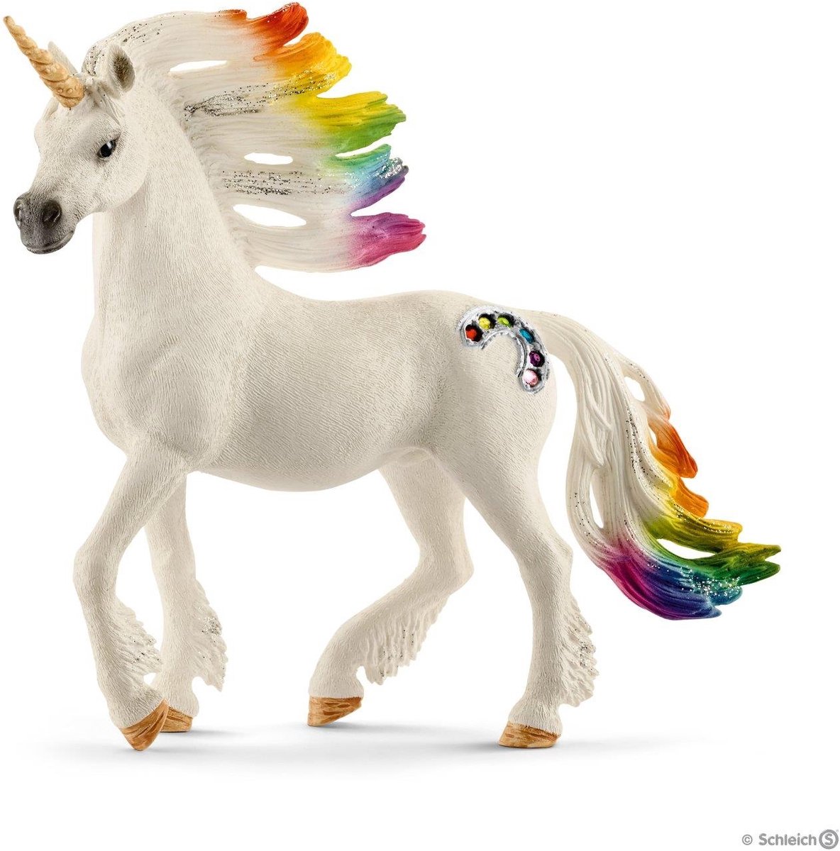 Regenboogeenhoorn hengst van Schleich. De manen van de regenboog eenhoorn stralen in het licht van de morgenzon in alle kleuren van de regenboog. Hun flanken zijn versierd met gekleurde edelstenen. Doordat het schuwe dieren zijn, zijn er veel raadsels omdat men ze zelden ziet.