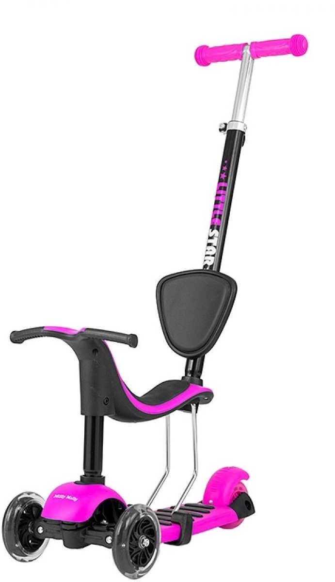 Milly Mally Little Star 3-in-1 stepDe Little Star step is een model dat meegroeit met een kind en zich aanpast aan de veranderende behoeften. Een duwfiets voor de allerkleinsten wordt omgetoverd tot een comfortabele loopfiets en uiteindelijk tot een snelle step. Het ontwerp kan eenvoudig worden getransformeerd. Je kind zal zich zo ontwikkelen, waardoor de benen en de wervelkolom worden versterkt en vaardigheden worden verbeter... lees meer over dit product