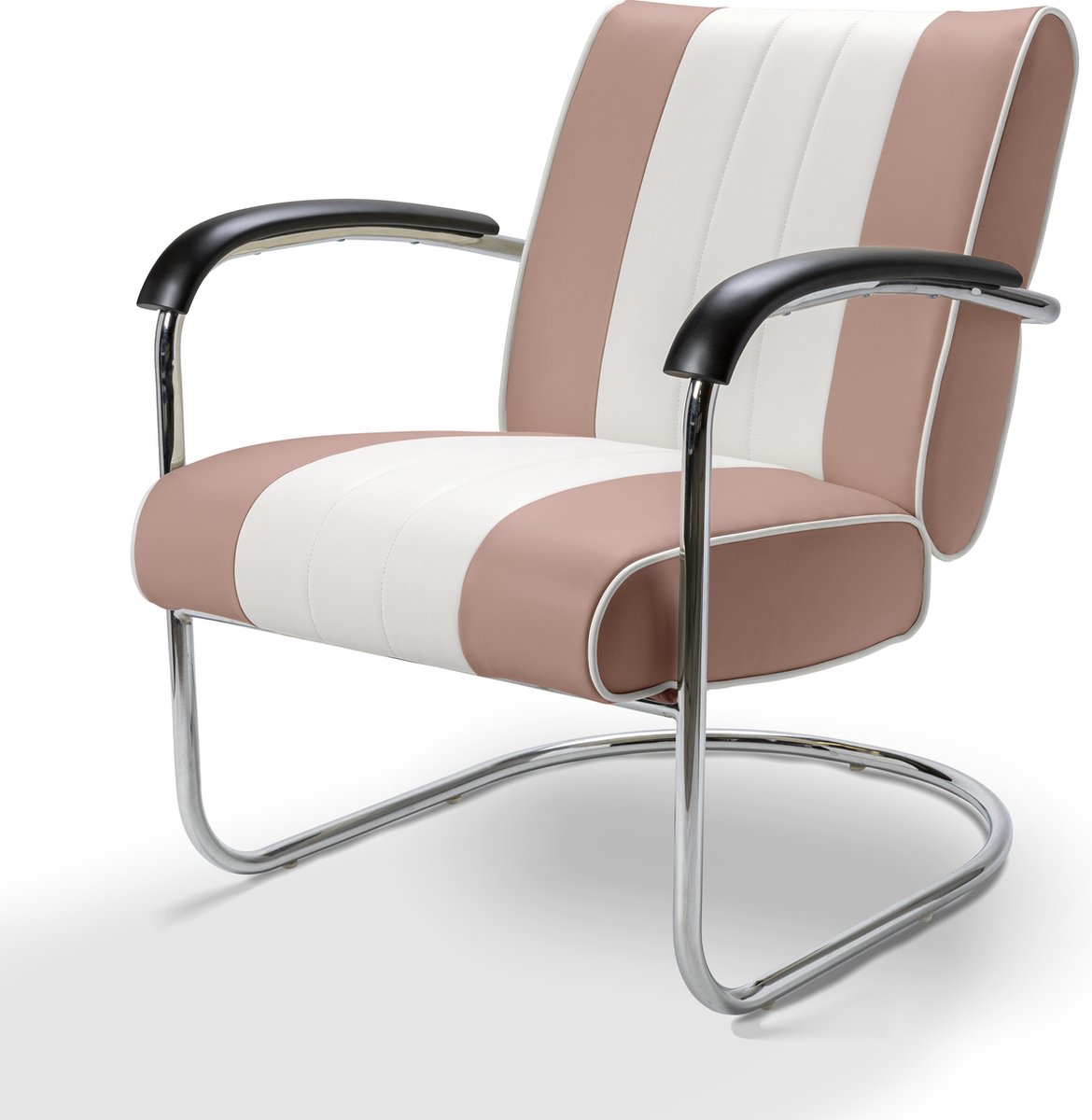 Even helemaal tot rust komen doe je met de Bel Air Retro Loungestoel LC-01 Dusty Rose. Deze mooie loungestoel komt in vintage roze bekleding met uitspringende witte strepen. Deze kenmerkende bekleding samen met de chromen poten geeft deze mooie stoel die echte jaren 50 look. Combineer de loungestoel met de Bel-Air retro bank en salontafel om een echte jaren 50 hoek in de woonkamer te creëren. De Bel Air Retro Loungestoel is een heerlijk comfortabele bank en is met zijn retro look de ideale uitbreiding voor zowel een retro als modern interieur.