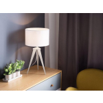 Deze statief tafellamp in wit voegt een vleugje individualiteit toe aan elke moderne ruimte. Met zijn strakke design komt deze decoratieve lamp perfect tot zijn recht in een Scandinavisch interieur. De grote lampenkap van polykatoen verspreidt een mooi en diffuus licht, terwijl het witte frame met slanke poten van stevig metaal een moderne charme toevoegt.