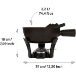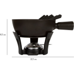 De zwarte pan is gemaakt van vuurvast keramiek en kan eenvoudig op het gasfornuis worden geplaatst om de kaas te laten smelten. Vervolgens kun je de pan op het bijgeleverde gietijzeren onderstel plaatsen, waar de fonduebrander ervoor zorgt dat je kaasfondue urenlang heerlijk warm blijft.