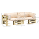 De kussens hebben een elegante zandkleur en vormen een prachtig contrast met het groen geïmpregneerde grenenhout van de bankenset. De totale afmetingen van de set zijn 220 x 66 x 65 cm (B x D x H),terwijl de zitting een breedte heeft van 200 cm en een diepte van 50 cm. De zithoogte vanaf de grond, zonder kussen, is 25 cm, terwijl het kussen zelf een dikte heeft van 10 cm.