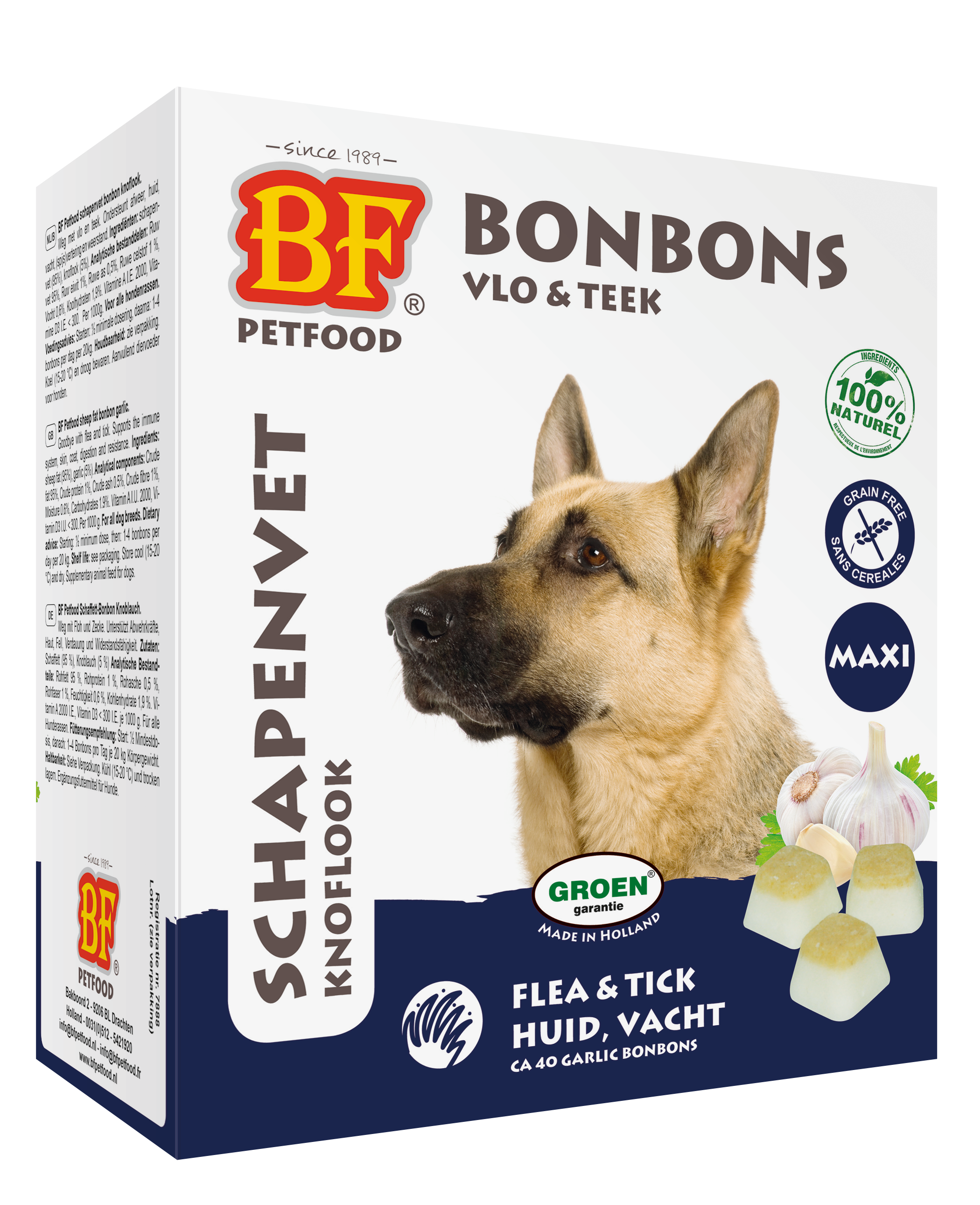 Geef uw huisdier de voordelen van BIOFOOD Schapenvet Bonbons Maxi Knoflook en Alliine en geniet van een stralende vacht, een gezonde huid en een verbeterde darmflora!