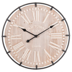 Landelijke klok met een robuuste uitstralingDeze bruine houten landelijke klok met een zwart metalen rand en witte Romeinse cijfers is een prachtige toevoeging aan je interieur. Het merk Clayre & Eef staat bekend om zijn hoogwaardige klokken en deze wandklok is daar geen uitzondering op. Met een diameter van 60 cm is deze klok een echte blikvanger in elke ruimte.Stoer en vintage designHet stoere uiterlijk van de vintage mi... lees meer over dit product