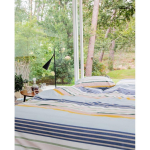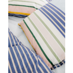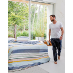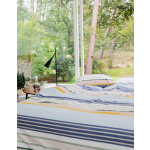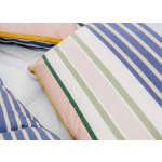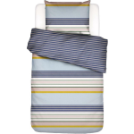 Walk the line heeft een speels strependessin in stoere blauwtinten, afgewisseld met vrolijk geel en zachtroze, wat zorgt voor een casual en eigentijdse uitstraling in je slaapkamer. De achterzijde van het dekbedovertrek is blauw met beige gestreept, waardoor je eenvoudig kunt variëren in de look van je bed. Kies voor een levendige en opvallende uitstraling of juist voor een rustige en neutrale setting.