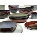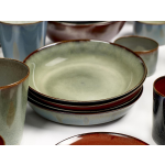 Dit exclusieve servies is vervaardigd uit Stoneware en afgewerkt met reactief glazuur. Het bijzondere aan dit proces is dat het servies twee keer gebakken wordt: eerst op 700°C en daarna op 1200°C. Dit zorgt ervoor dat het stoneware dun en licht afgewerkt kan worden, terwijl het toch aan de hoogste kwaliteitseisen voldoet.