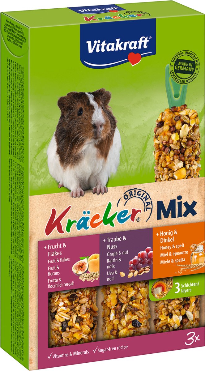 De orginele Vitakraft Trio-Mix Kräckers zijn een lekkernij, 3 verschillende smaken Kräckers in de mix met lekkere honing, noten en fruit op een natuurlijk knabbelhoutje. De Kräckers zijn lekker van smaak en 3-voudig gebakken waardoor de ingrediënten stevig vastzitten en de cavia moet werken voor zijn voedsel zoals in de natuur. Dit geeft de cavia de nodige beweging en zorgt ervoor dat hij zijn snijtanden op natuurlijke wijze kan afslijten. De Kräckers zijn op de voedingsbehoeften van de cavia afgestemd. Het Vital-Complex voorkomt gebreksverschijnselen en zorgt voor extra vitaliteit van het dier. De Kräckers bevatten waardevolle vitamines, extra vitamine C en volgens een suikervrije receptuur bereid.