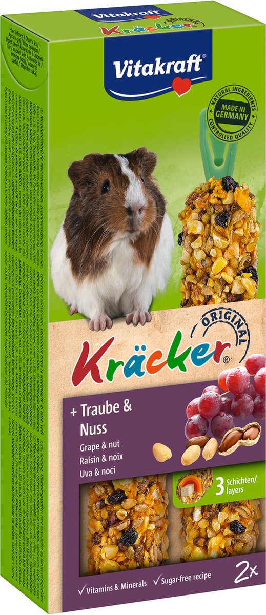 De Vitakraft Druif/Noot-Kräcker is een kwaliteitsproduct dat perfect is voor je cavia. Dit product is gemaakt door Vitakraft, een merk dat bekend staat om zijn hoogwaardige huisdierproducten. De Druif/Noot-Kräcker is een onmisbaar onderdeel van het dieet van je cavia en zorgt voor een gezonde variatie.