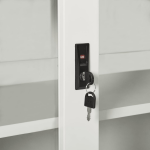 Met een praktisch slot biedt deze archiefkast een veilige opslagplek voor je persoonlijke documenten, beschermd tegen onbevoegde toegang. Ideaal voor kamers met beperkte ruimte of smalle gangpaden, waar traditionele openslaande deuren geen optie zijn. De lichtgrijze kleur vormt een stijlvolle toevoeging aan elke werkruimte en het gebruik van staal en gehard glas zorgt voor een moderne uitstraling.