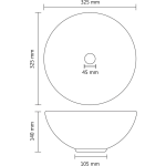 De wastafel is gemaakt van hoogwaardig keramiek en heeft een totale afmeting van 32,5 x 14 cm (ø x H). Het afvoergat heeft een diameter van 4,5 cm. Let op: de afvoerpijp is niet bij de levering inbegrepen. De wastafel is voorzien van een mat oppervlak en heeft een luxe design dat direct de aandacht trekt.