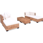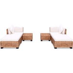 Deze set bevat alles wat je nodig hebt voor een comfortabele lounge-ervaring. De levering bevat 2 hoekbankensegmenten, 2 hockers, 2 salontafels, 2 zitkussens, 4 rugkussens, 2 voetenbankkussens en 2 kussentjes. De rattankleur is bruin en de kussens zijn uitgevoerd in een mooie witte kleur. Het frame is gemaakt van natuurlijk rattan en mahoniehout, terwijl de kussens zijn vervaardigd van stof en schuim. Met afmetingen van 67 x 67 x 58 cm voor de hoekbank, 67 x 67 x 27 cm voor de hocker en 47 x 47 x 27 cm voor de salontafel, biedt deze set genoeg ruimte om heerlijk te ontspannen.