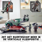 Dit LEGO ruimteschip is voorzien van vele interessante details, zoals een handvat voor het vliegen, een cockpit die open kan voor een LEGO minifiguur, ronddraaiende vleugels en dubbele blasterkanonnen. Hoewel de blasters niet echt kunnen schieten, voegen ze nog steeds een extra dimensie toe aan het speelplezier. Daarnaast bevat de set twee LEGO minifiguren: Boba Fett en de Mandalorian, compleet met hun eigen wapens en een carbonietsteen die in een opbergruimte van het ruimteschip past.
