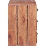 Het nachtkastje is eenvoudig te monteren en heeft een afmeting van 35 x 25 x 35 cm (B x D x H). De houtnerven en kleuren variëren, waardoor elk nachtkastje een eigen karakter heeft. Het gerecyclede hout behoudt de kenmerken van verschillende houtsoorten, zoals mahonie, grenen, teak, beuken, eiken, ceder, mangohout en acacia.