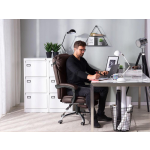 Naast het comfort biedt deze bureaustoel ook een stijlvolle en moderne uitstraling. De donkerbruine kunstleren bekleding en de metalen poten geven de stoel een elegante look die perfect past in elk modern interieur. De directeursstoel is uitgevoerd in een kap van donkerbruin kunstleer en heeft armleuningen voor extra comfort. Met zijn afmetingen van 67 cm breed, 114-122 cm hoog en een zitoppervlak van 54x53 cm is deze stoel geschikt voor een breed scala aan gebruikers.