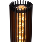De Lionel tafellamp is gemaakt van zwart metaal met een mat, gezandstraald oppervlak. De lamp heeft een vlakke, vierkante voet en bestaat uit een E27-lamphouder met daaromheen een brede kap van afzonderlijke metalen stutten. Door de open vormgeving met openingen tussen de stutten is de lamp van buitenaf zichtbaar en kan het uiterlijk van de lamp worden aangepast met de keuze van de lamp. Een LED-lamp in de vorm van een heldere buis, waarin de LED's zijn gerangschikt in gedraaide gloeidraadtechnologie, zorgt voor een prachtige uitstraling. U kunt direct een geschikte lamp bestellen door op "Kies lamp" te klikken.