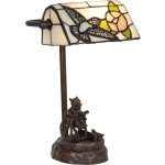 Met zijn klassieke uitstraling en tiffany stijl is deze tafellamp een geweldige toevoeging aan elke ruimte. De kap van de lamp is prachtig versierd met een vogelmotief, terwijl de voet een lieflijk tafereel toont van een kat die op een schommelstoel een boek bekijkt. Deze unieke details geven de lamp een speelse en charmante uitstraling.