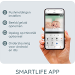 Verbind en bedien de wifi babyfoon met de gratis Smart Life App, die zowel beschikbaar is voor Android als iOS. Met deze app kun je direct video's opslaan op je telefoon en screenshots maken in HD-resolutie. Wil je continu beeld opnemen? Plaats dan een Micro-SD kaart en bekijk de beelden eenvoudig via de app. Zo kun je altijd mooie momenten met je kindje vastleggen en terugkijken.