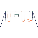 Deze schommelset wordt geleverd met een stevig stalen A-frame, twee enkele schommels, twee gymnastiekringen en een face-to-face schommel voor dubbel schommelplezier. Het face-to-face schommelzitje biedt ruimte aan twee kinderen om samen te genieten. Dankzij het duurzame stalen frame en de weerbestendige kunststof zitjes is deze set bestand tegen alle weersomstandigheden en gemakkelijk te monteren. Sterke beugels, bouten, haken en touwen zorgen ervoor dat alle schommels stevig vastzitten aan het A-frame.