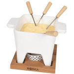 De Tapas Fondue Bianco L bevat een kleine fonduepan van aardewerk met een inhoud van 600 ml. Dit is voldoende voor 350 gram kaasfondue of 400 ml saus. Het bijgeleverde onderstel met donker houten accenten zorgt voor een elegante uitstraling. Daarnaast ontvang je ook vier stijlvolle fonduevorkjes, zodat iedereen kan genieten van zijn favoriete dip.