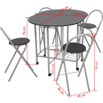 Deze opvouwbare MDF eetkamerset wordt geleverd met 1 tafel en 4 stoelen en is verkrijgbaar in een stijlvolle zwarte en zilveren kleur. De afmetingen van de tafel zijn 112 x 80 x 79 cm (L x B x H) en de stoelen zijn 45 x 36 x 76 cm (B x D x H). De breedte en diepte van de zitting zijn beide 29,8 cm, met een zithoogte vanaf de grond van 54,5 cm. De set is eenvoudig te monteren en wordt geleverd met alle benodigde instructies en materialen.