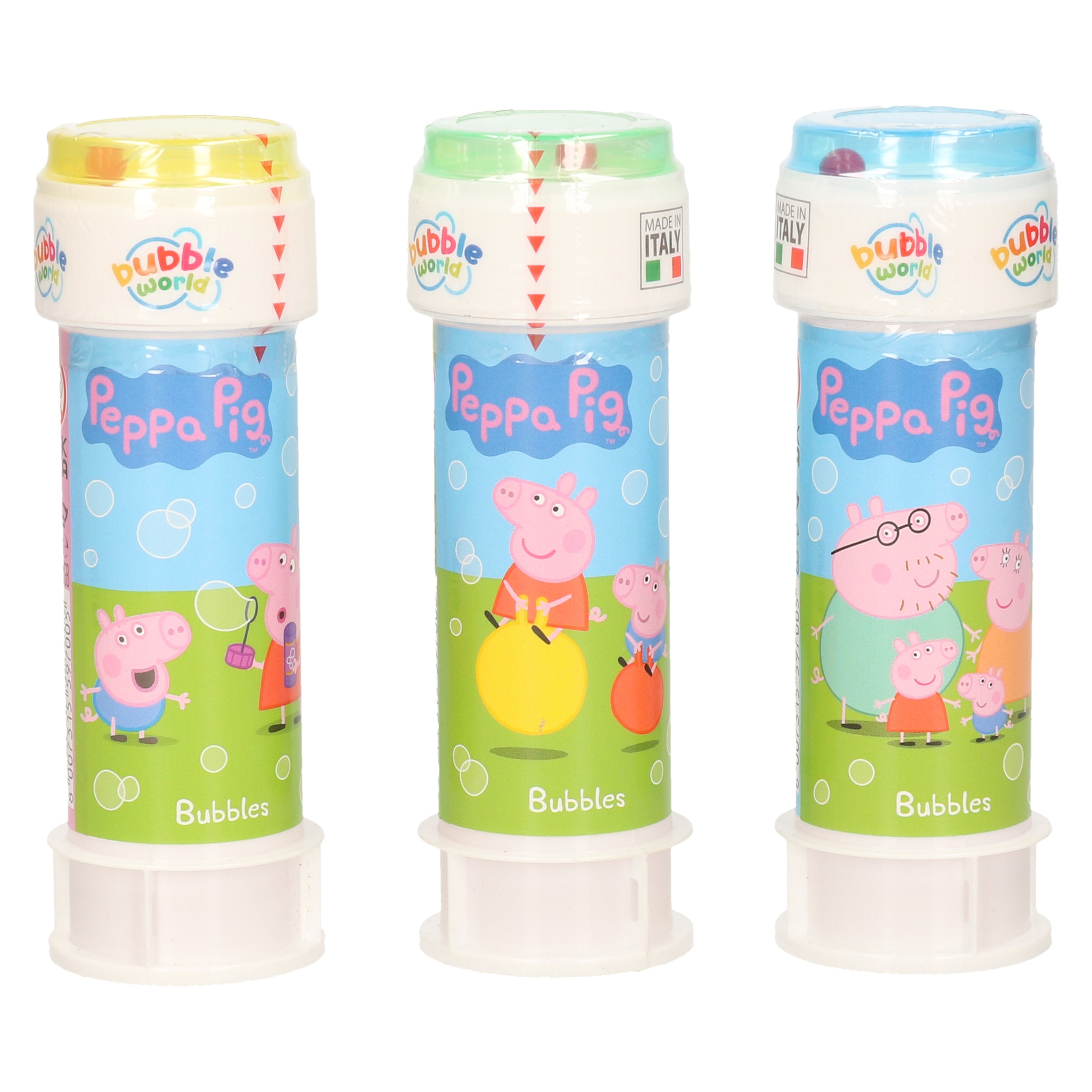 3x Peppa Pig bellenblaas flesjes met spelletje 60 ml voor kinderenLaat je kinderen genieten van eindeloos bellenblaasplezier met deze set van 3 Peppa Pig bellenblaasflesjes! Elk flesje is voorzien van een vrolijke opdruk van Peppa Pig en bevat een spannend bal spelletje in de dop. Laat je verrassen door een willekeurige kleur en opdruk bij elke bestelling, waardoor elke bellenblaaservaring uniek is. De bellenblaasflesjes zi... lees meer over dit product