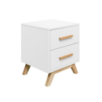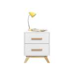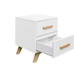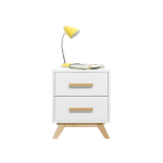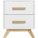 Het Bopita Fenna Nachtkastje is uitgevoerd in een smetteloos witte kleur met naturelkleurige handgrepen en schuine poten, wat zorgt voor een subtiele Scandinavische touch in het design. De twee opbergladen zijn voorzien van een softclosing mechanisme, waardoor ze geruisloos sluiten.