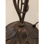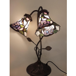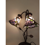 Deze tafellamp is gemaakt van polyresin en glas en heeft een afmeting van 34x28x47 cm. De twee bloemvormige glazen kapjes stralen een warm en gezellig licht uit, zowel bij elektrische verlichting als bij daglicht. De prachtige effecten van het Tiffany glas komen op elk moment van de dag tot hun recht.