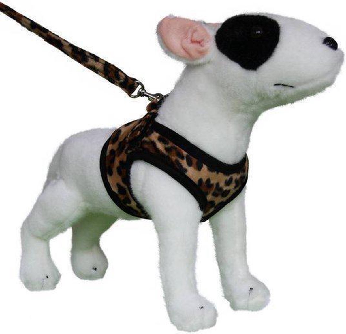 Een comfortabel harnas in een hippe luipaardprint. Aan de bovenkant, op de rug, bevinden zich een sluiting met klittenband en een kliksluiting. Maat S : borstomvang 34 - 38 cm