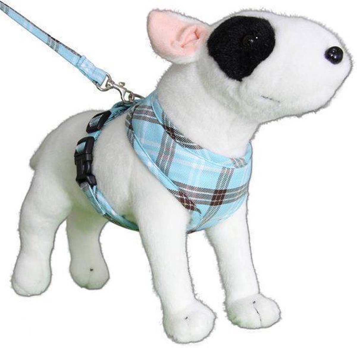 Een leuk en comfortabel harnas dat is uitgevoerd in een turquoise Schotse ruit. Het tuigje heeft een kliksluiting en een verstelbare borstband. Maat M: Borstomvang 50-66 cm.