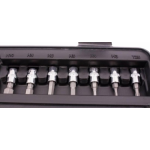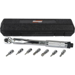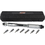 De momentsleutel is omschakelbaar, zodat je zowel links- als rechtsom kunt draaien. Dit maakt het eenvoudig om bouten vast te draaien of los te maken, wat je werk efficiënter maakt. Daarnaast wordt de set geleverd met 7 biteinsatze, waardoor je voor elke klus het juiste gereedschap binnen handbereik hebt.
