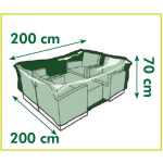 Met een afmeting van 70 x 200 x 200 cm past de tuinmeubelhoes perfect om je loungeset. De hoes wordt geleverd inclusief ogen en nylonkoord onderaan, zodat je de hoes veilig kunt bevestigen en strak kunt aantrekken. Zo blijft je tuinmeubel goed beschermd, zelfs bij harde wind of regen.