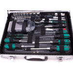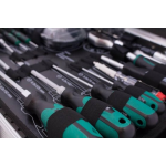 Daarnaast bevat de gereedschapskoffer een 3/8" ratel met doppen, bougiedop en verlengingen, samen met een handige schroevendraaiergreep en een 61-delig bitassortiment met snelwissel bithouder. Al deze gereedschappen worden geleverd in een handige bewaarbox.